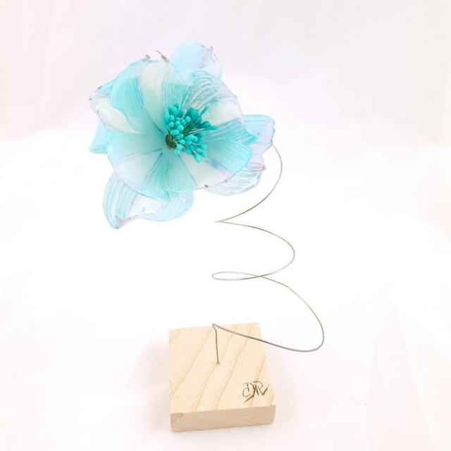 Montée sur un ressort en fil d'acier, elle regarde vers l'espace, cette petite fleur tout de bleu vêtue, issue de nos bouteilles plastiques. Elle est fixée sur un socle en bois.