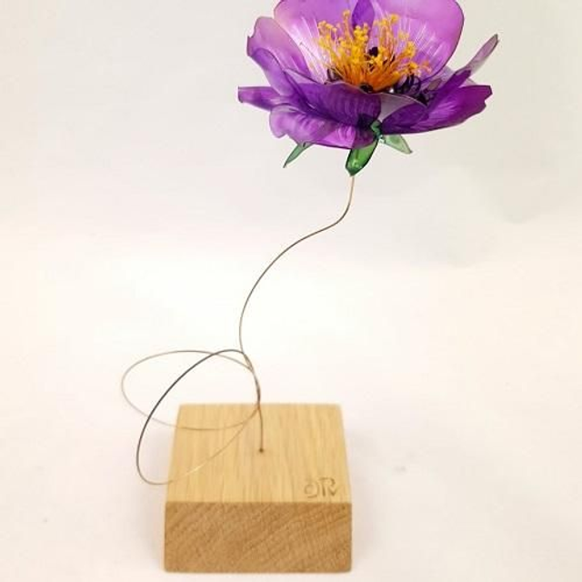 Une fleur issue de nos bouteilles en plastique, pleine de gaieté par ses étamines toutes de jaune vêtues tranchant avec le violet de sa corole . Elle se dresse joyeusement sur sa double sphère en fil d'acier, le tout sur un socle en chêne massif.