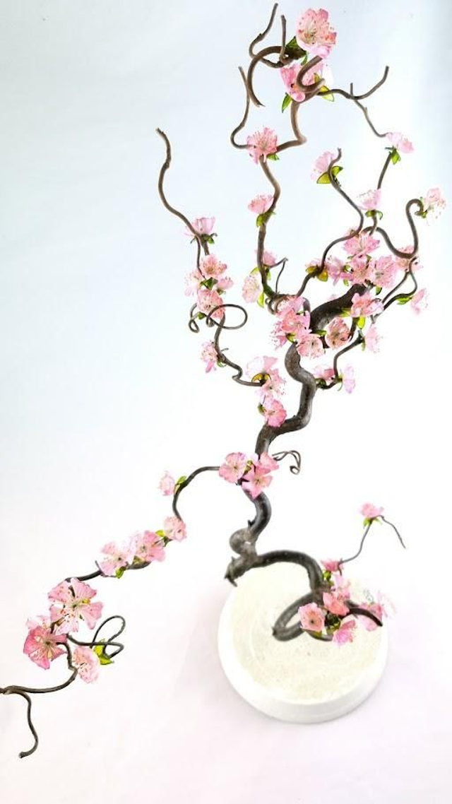 Il n'a de "rikiki" que la taille de ses fleurs. Monté sur noisetier tortueux, la finesse de ses fleurs lui donne un air de véritable bonsaï.