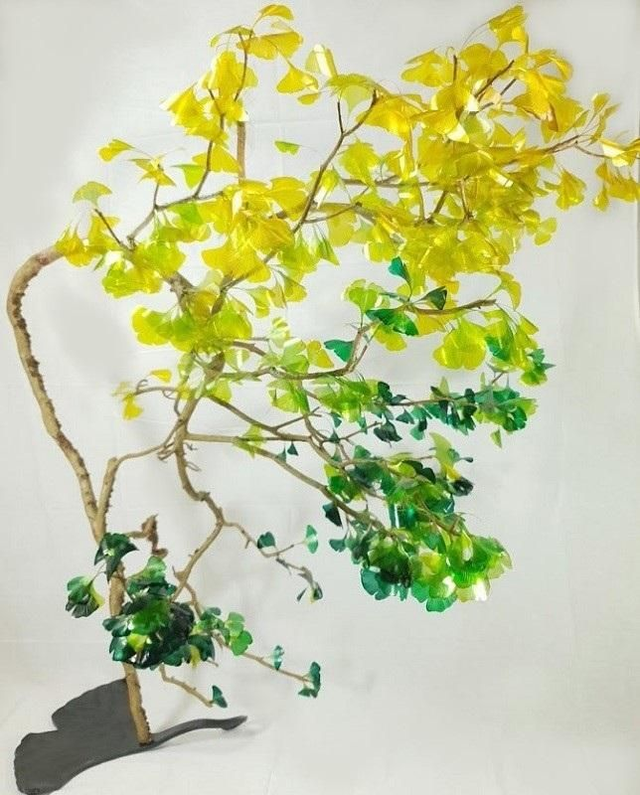 Les feuilles de gingko ont été sculptées une à une à partir du plastique de nos bouteilles, puis mises en couleur et vernies.