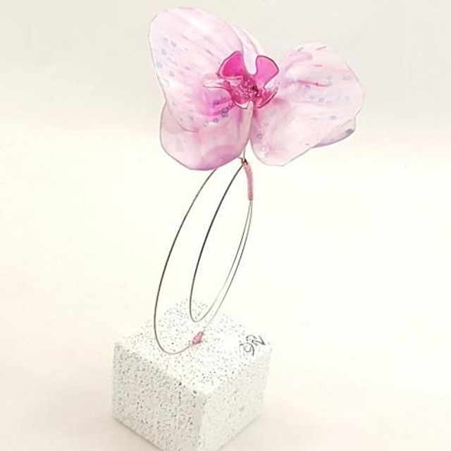 Inspirée du jardin de Monet, cette délicate orchidée toute de rose vêtue invite à la tendresse. Montée en équilibre sur une tige d'acier dont les rondeurs évoquent la féminité, elle s'ancre sur un socle en béton cellulaire peint en blanc.