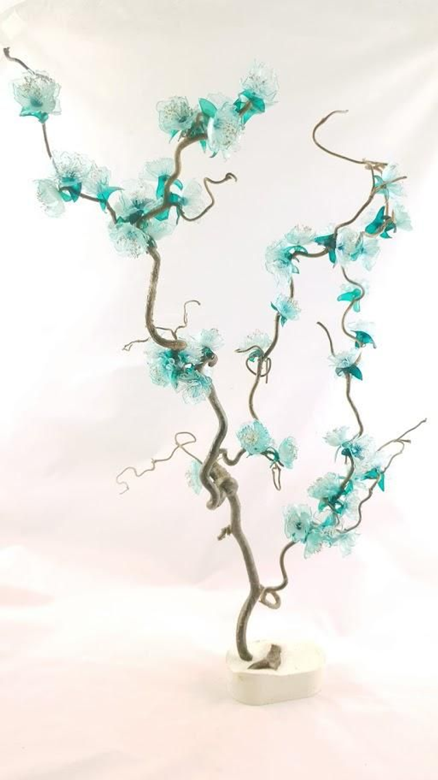 Fleurs issues de nos bouteilles, poésie montée sur noisetier tortueux ,socle en béton, le tout verni